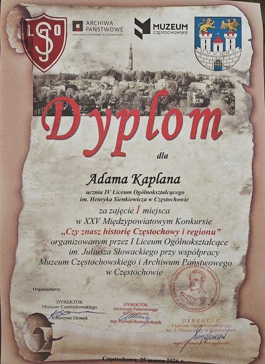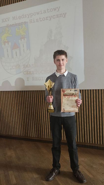 Miło nam poinformować, że uczeń naszej szkoły - Adam Kaplan z klasy 1c zajął I miejsce w XXV Międzypowiatowym Konkursie "Czy znasz historię Częstochowy i regionu" organizowanym przez I LO im. J. Słowackiego przy współpracy Muzeum Częstochowskiego i Archiwum Państwowego w Częstochowie.